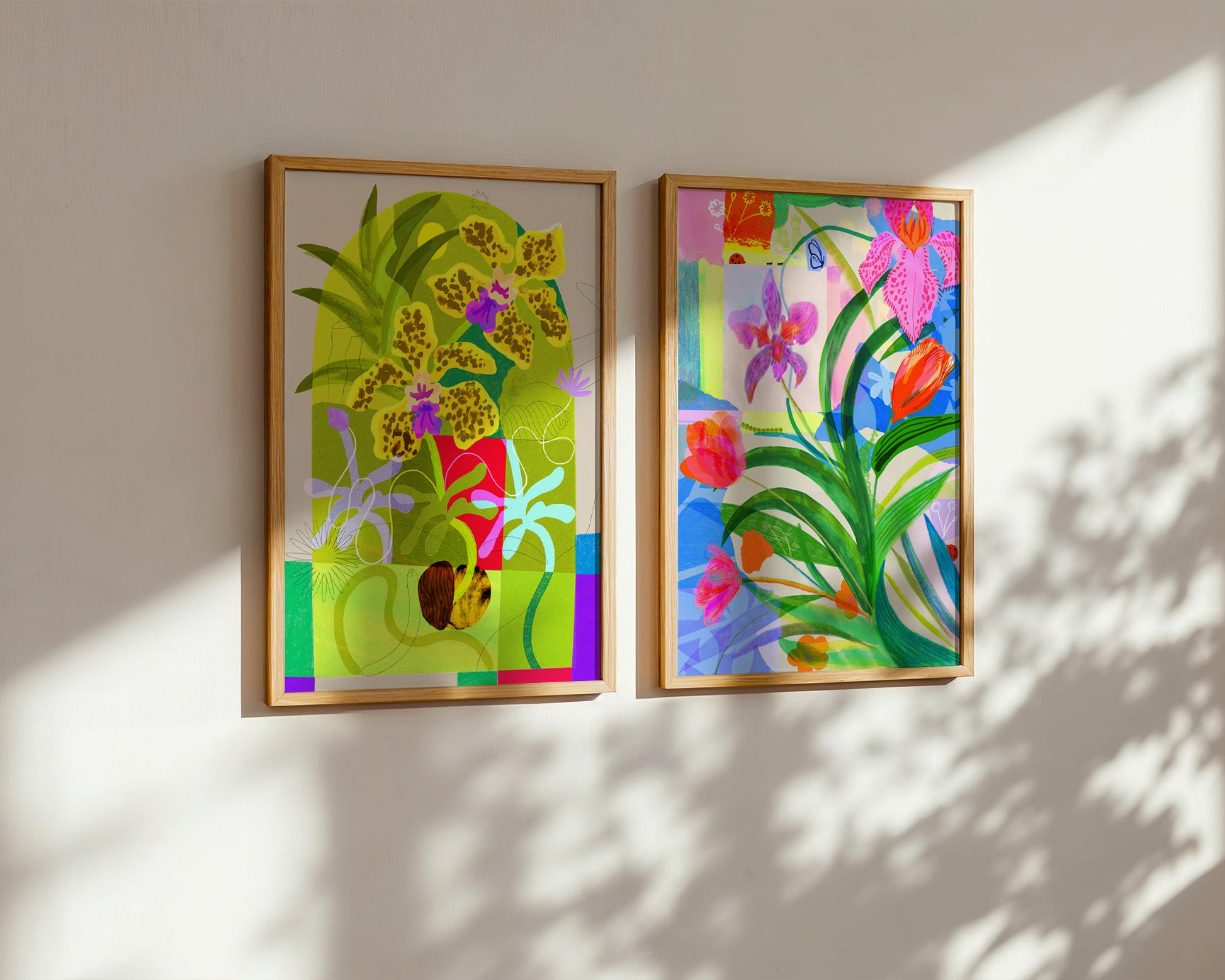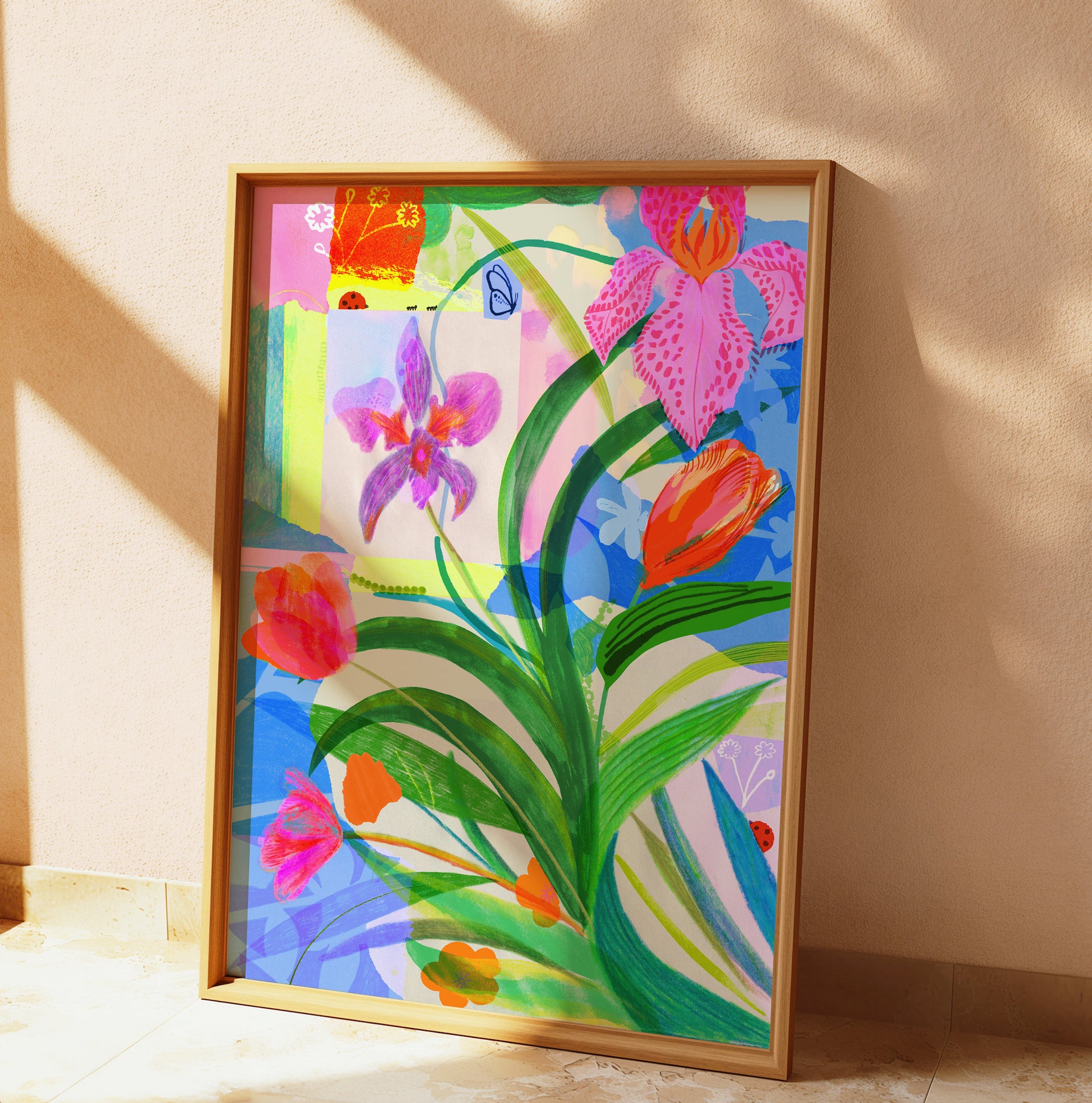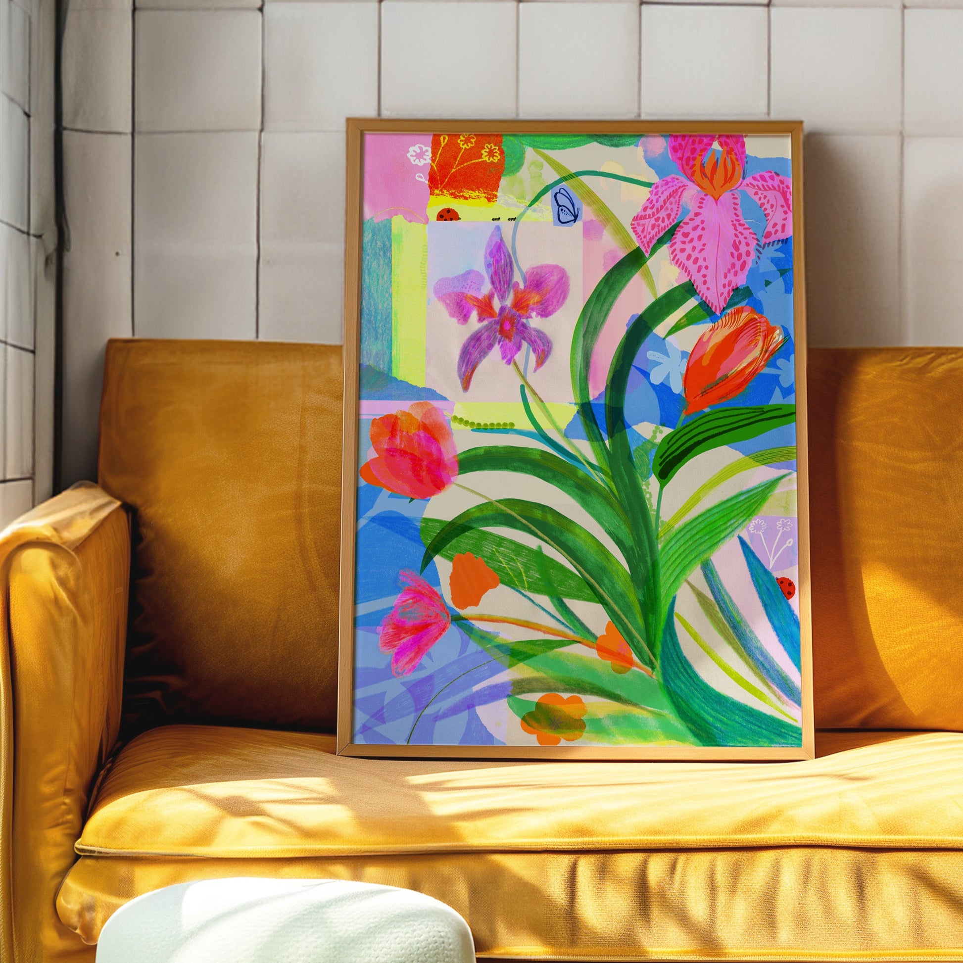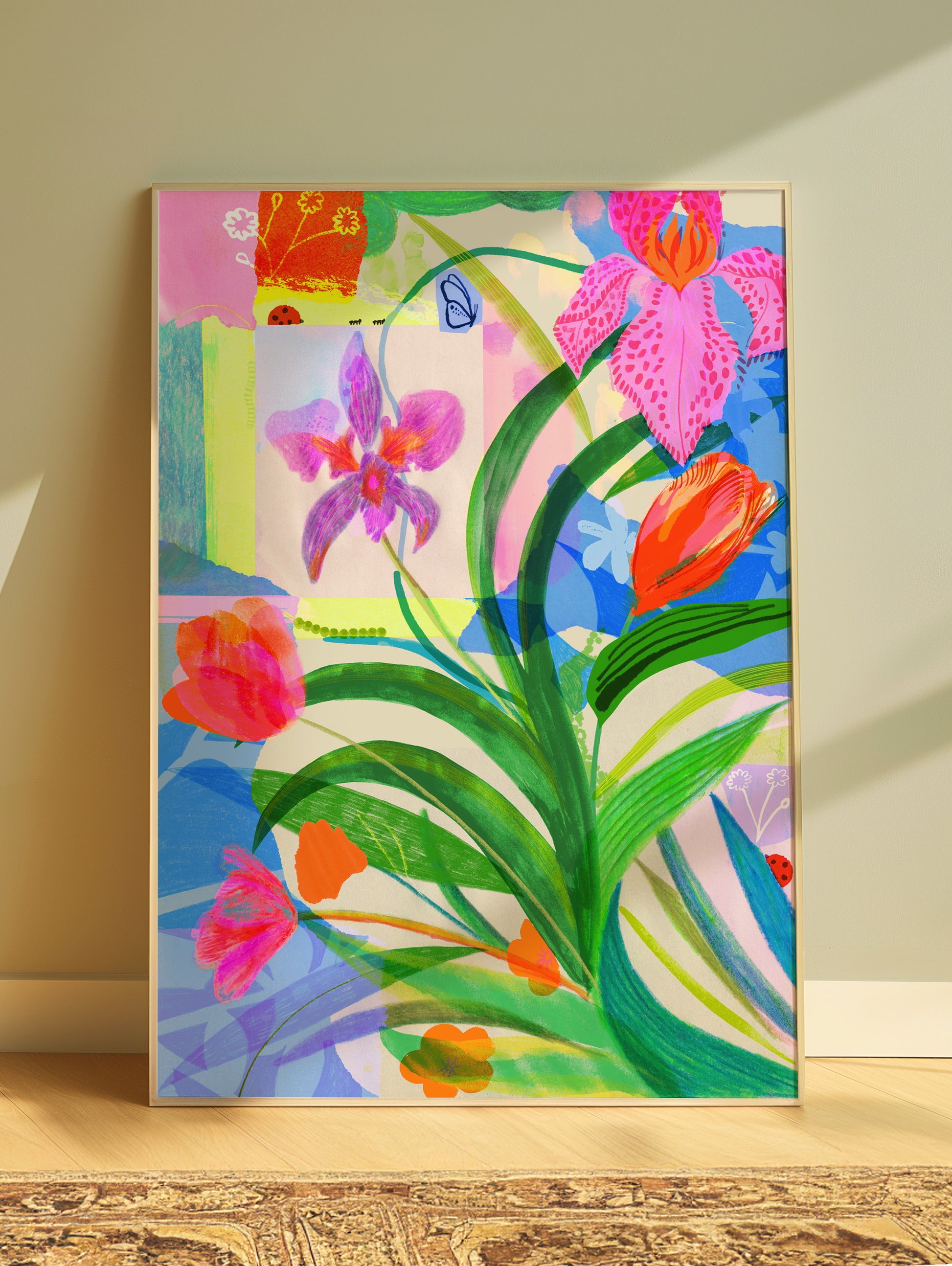 Each print is from an artwork originally made by Lucy using a mixed media approach. Working with hand-drawn elements and painted textures alongside traditional collage, then scanning them in and layering them up digitally.